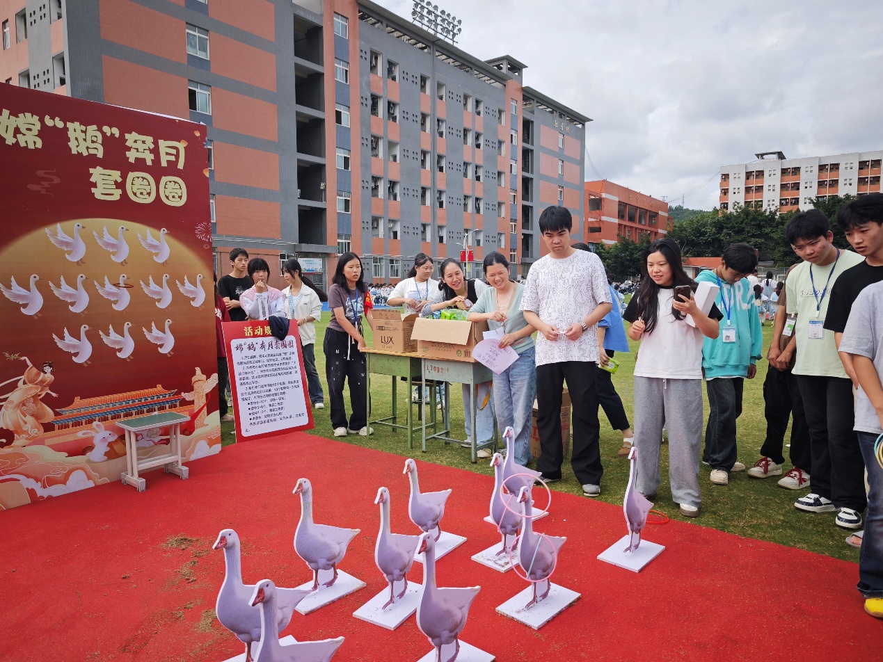 嫦“鹅”本月套圈圈游戏区笑声不断,大家瞄准目标、精准投掷,不少老师表示梦回童年放学时套圈的快乐,学生们体验着收获“战利品”的喜悦。