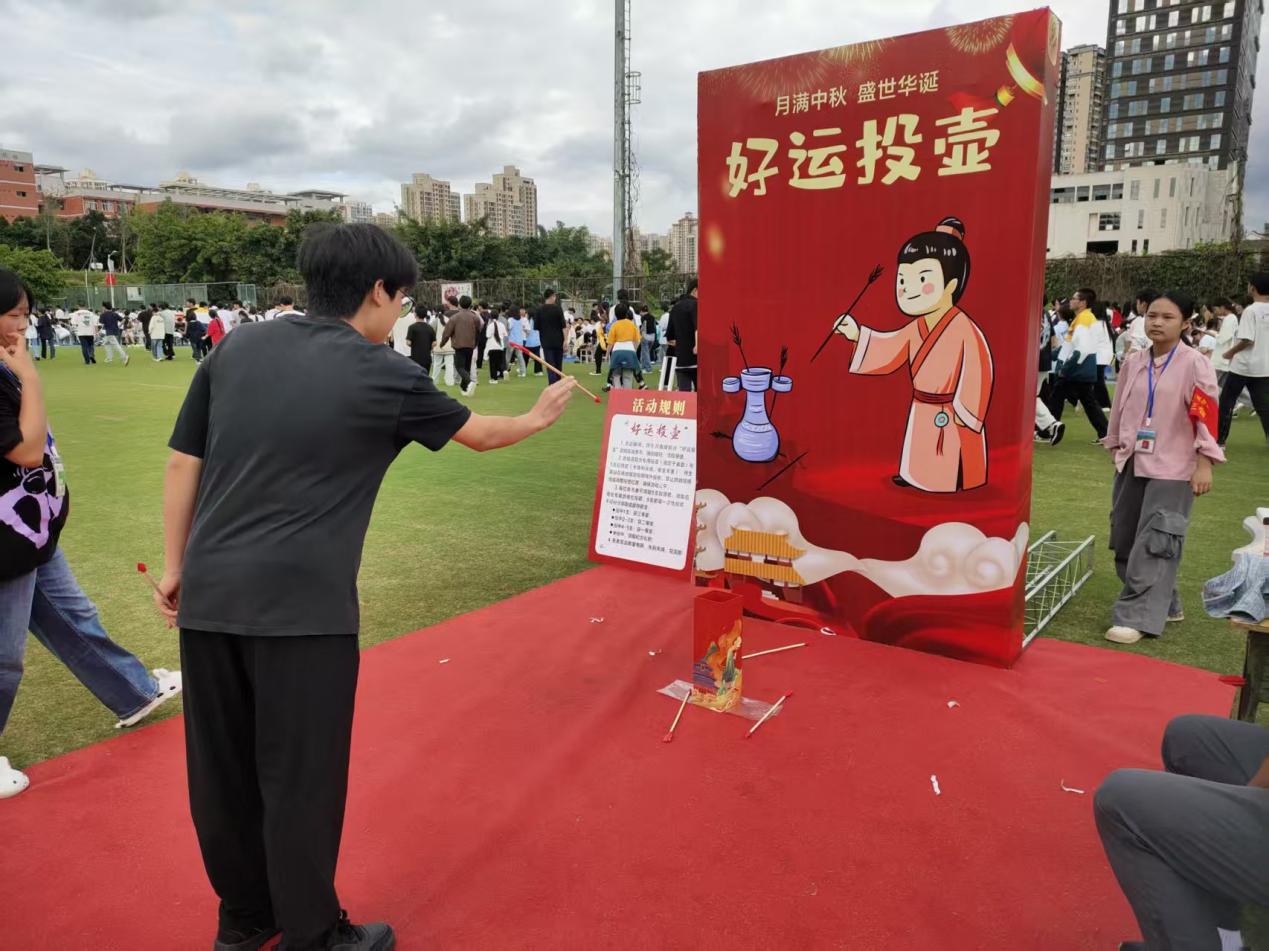 9月29日,校园内最热闹的当属温情游园会。现场设置了多个趣味游戏摊位以及丰富的奖品,吸引了大批师生参与。