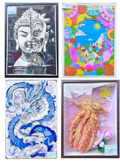 幼儿保育专业美术展售区,百余件作品童趣盎然、创意十足,全方位展现了同学们的专业素养与艺术想象力。剪纸画《缤纷小镇》用温暖的色调定格美丽的瞬间;各种各样的手工作品琳琅满目,细节刻画真实、造型有趣可爱;掐丝画、古风等作品,兼具观赏性与实用性。