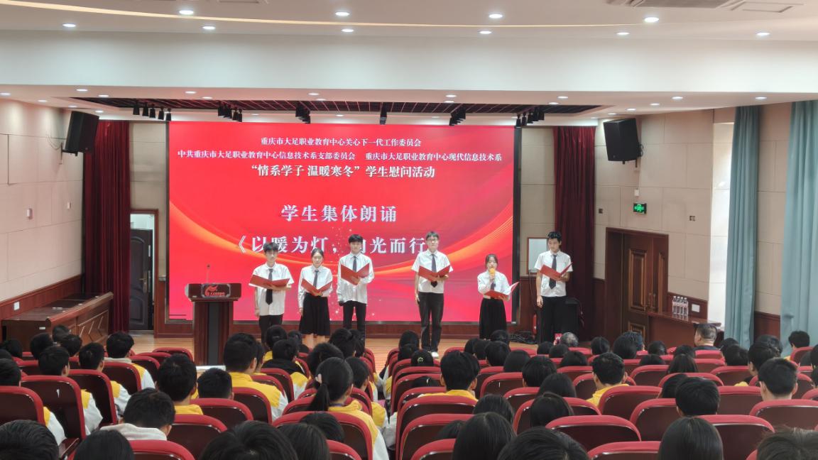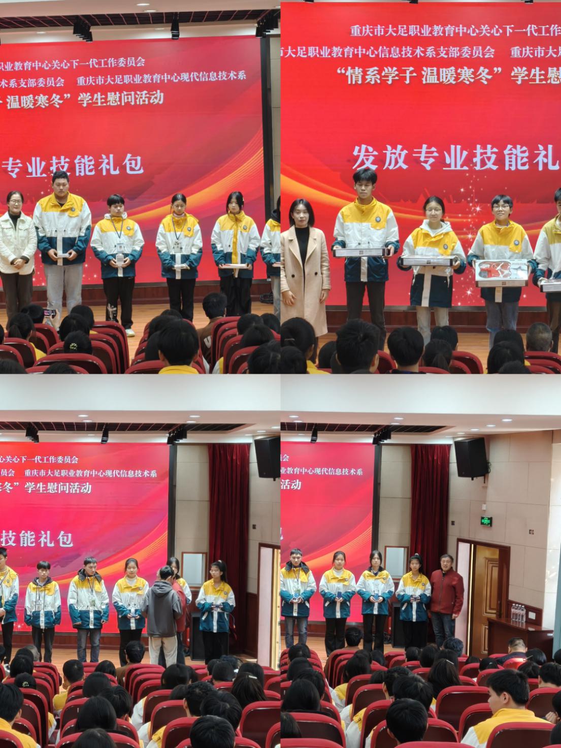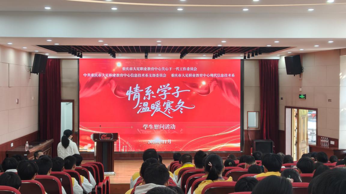 寒冬送暖,情系学子;党建引领,大爱无疆。为深入贯彻落实党的教育方针和立德树人根本任务,积极响应国家职业教育提质培优行动计划,践行“不让一个学生因贫困而失学”的庄严育人承诺,充分激活“校-企-校-社”协同育人矩阵效能,11月19日,重庆市大足职业教育中心现代信息技术系在学校三报告厅隆重举行“情系学子,温暖寒冬”贫困学生慰问仪式。学校党委委员、副校长彭冬梅,现代信息技术系党支部书记、主任邹汝全,党支部副书记吴晓丹,系副主任岳菊,校关工委代表何昌华,老教师代表龙跃勇,3+2对接高校(能源职业学院)副校长赵强、电梯学院院长智渊,校企合作企业硕士通智能科技有限公司副总彭科杨、重庆瑞佳达有限公司产教融合部老师李永东出席活动,全系62名受助学生参与本次活动,仪式由系部教师刘言主持。