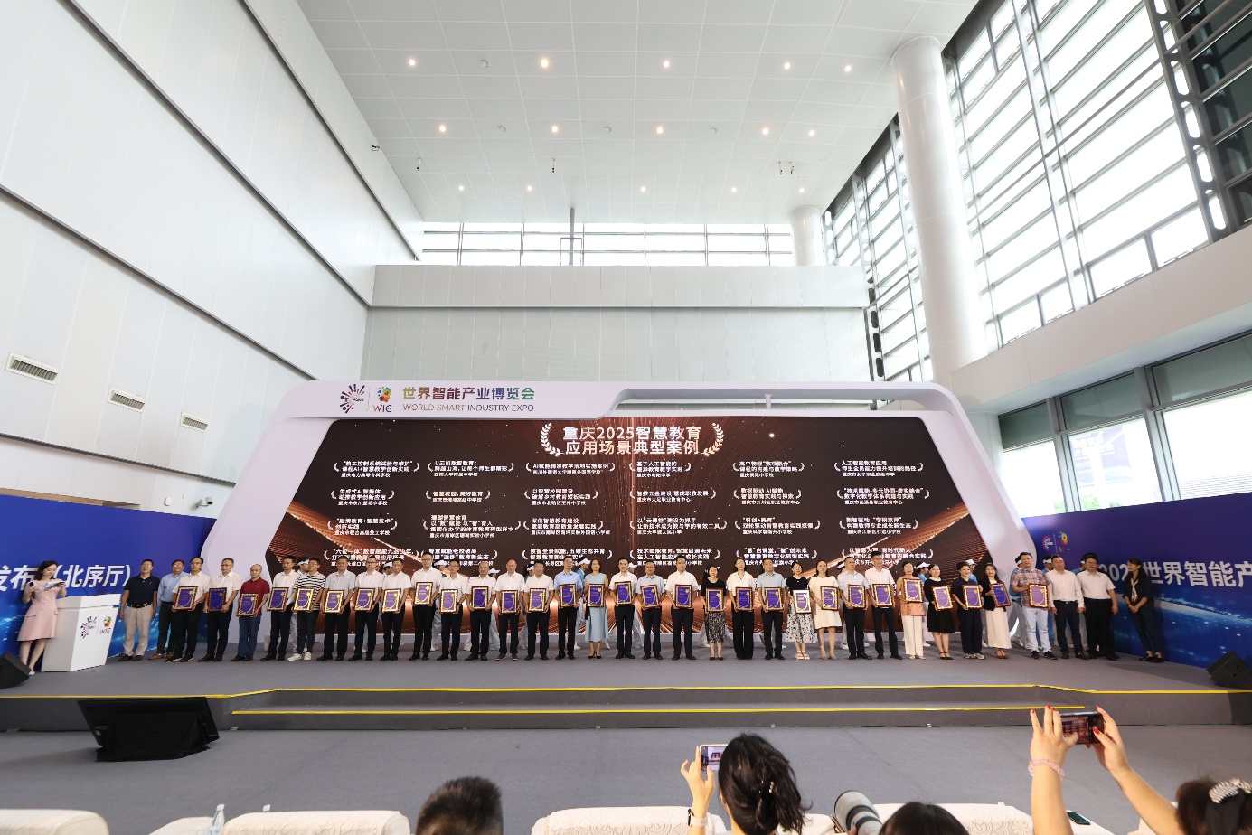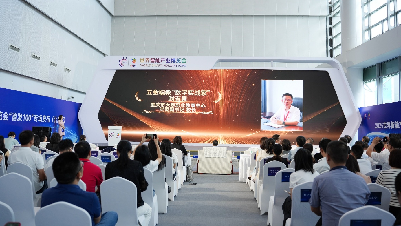2025年9月8日,重庆悦来国际会议中心中央大厅北序厅,重庆市2025智慧教育案例征集办公室和上游新闻主办的“发现智慧民生之美——重庆2025智慧健康/智慧教育应用场景典型案例发布会”盛大举行。作为2025世界智能产业博览会“首发100”专场发布的核心环节,本次活动汇聚了全市教育科技领域的先锋力量,发布30个智慧教育应用场景典型案例及30位智慧教育领航人物。重庆市大足职业教育中心党委副书记、校长封吉泉与信息技术中心主任曾德才代表学校参会,其中封吉泉校长作为智慧教育领航人物代表接受双重荣誉授牌及媒体采访。