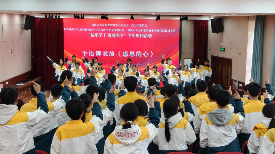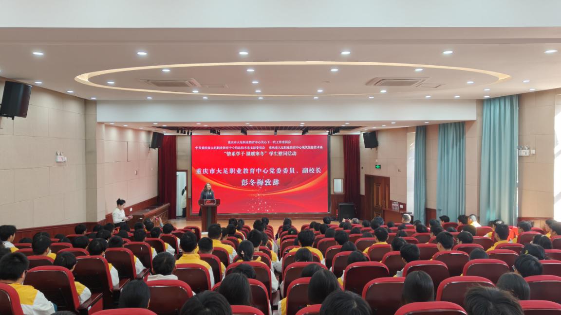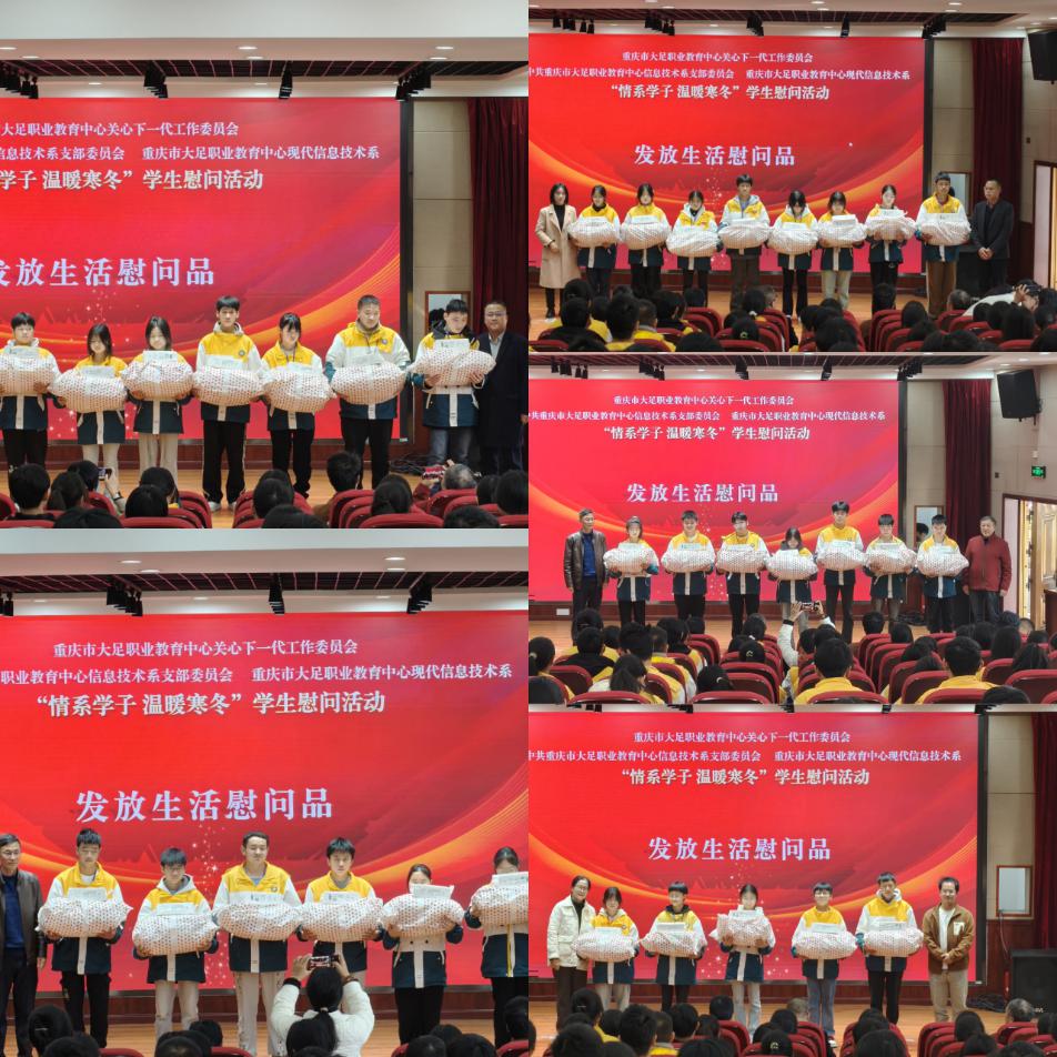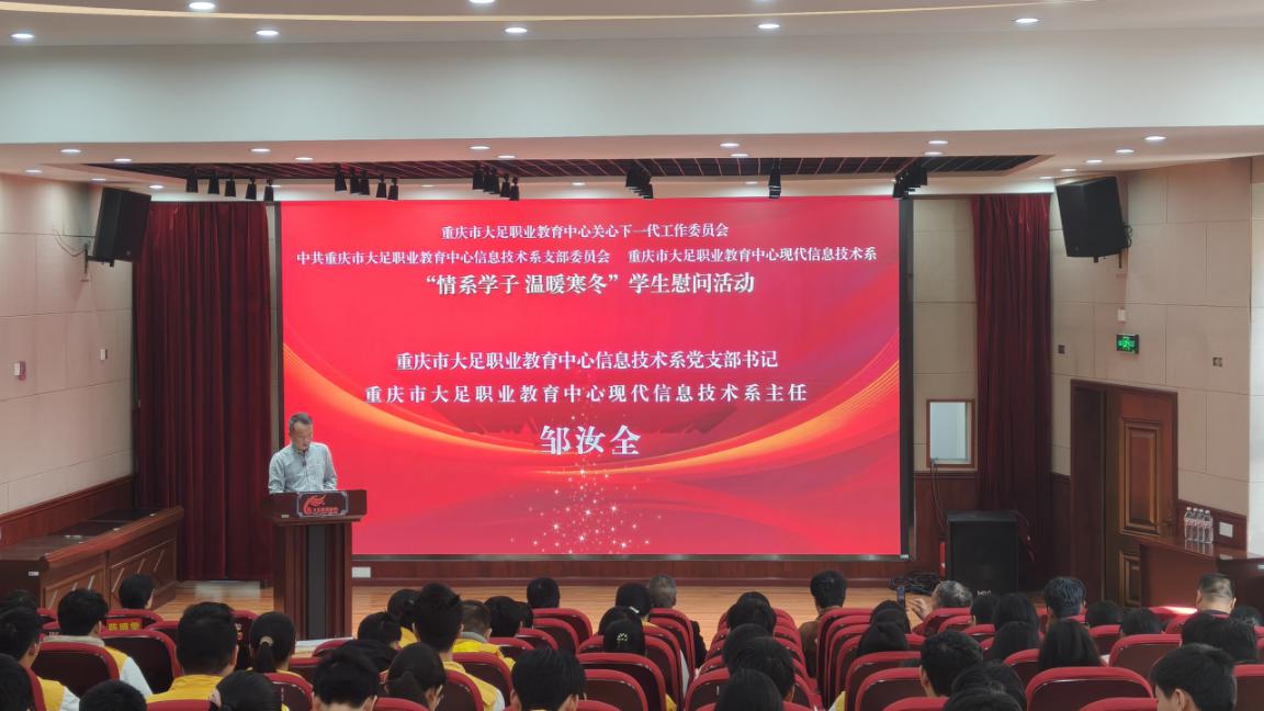 寒冬送暖,情系学子;党建引领,大爱无疆。为深入贯彻落实党的教育方针和立德树人根本任务,积极响应国家职业教育提质培优行动计划,践行“不让一个学生因贫困而失学”的庄严育人承诺,充分激活“校-企-校-社”协同育人矩阵效能,11月19日,重庆市大足职业教育中心现代信息技术系在学校三报告厅隆重举行“情系学子,温暖寒冬”贫困学生慰问仪式。学校党委委员、副校长彭冬梅,现代信息技术系党支部书记、主任邹汝全,党支部副书记吴晓丹,系副主任岳菊,校关工委代表何昌华,老教师代表龙跃勇,3+2对接高校(能源职业学院)副校长赵强、电梯学院院长智渊,校企合作企业硕士通智能科技有限公司副总彭科杨、重庆瑞佳达有限公司产教融合部老师李永东出席活动,全系62名受助学生参与本次活动,仪式由系部教师刘言主持。