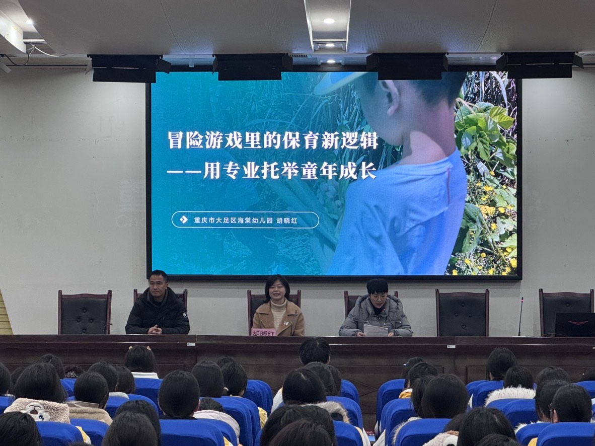 活动分为两个精彩环节。环节一,海棠幼儿园园长胡晓红带来了主题为“冒险游戏里的保育新逻辑——用专业托举童年成长”的讲座。胡园长首先介绍了大足区海棠幼儿园的基本情况,让大家对其办园理念有了初步认识。随后,深入阐释了冒险游戏,指出其是超越身体的多维度能力锻炼。在谈到为何要开展冒险游戏时,胡园长详细列举了诸多益处,如满足社交与创造力需求、基于科学假设、是探索与智力发展的顶级途径、能强烈连接儿童内心感觉、构建自我认知与智慧,还能培养儿童超强的“回弹力”与深层精神成长。