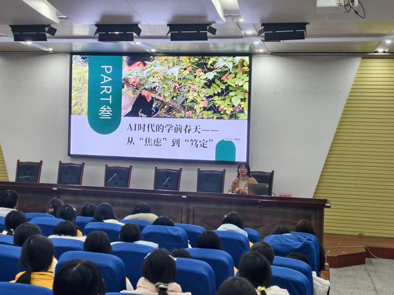 为了让大家更直观了解,胡园长通过视频介绍了海棠幼儿园开展的各类冒险游戏。同时,她就职业规划这个话题还分享了保育观念的升级;强调从呵护开始,在AI时代,学前教育要从焦虑走向笃定,具身认知、情感回应、动态专业调整以及游戏中的风险把控都不可替代“保育教师”这个职业;呼吁大家坚持做长期主义的践行者,成为持续学习者、细节打磨者、爱心坚守者。
