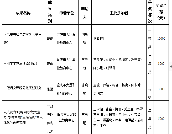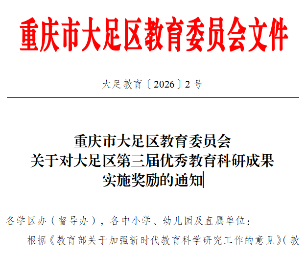 近日,重庆市大足区教育委员会正式发布《大足教育〔2026〕2号》文件,对大足区第三届优秀教育科研成果实施奖励。在本届成果奖评选中,职教中心四项高质量科研成果获一等奖1项,二等奖2项,三等奖1项,累计获得奖励资金2.1万元,彰显了学校在职业教育研究领域的实力。