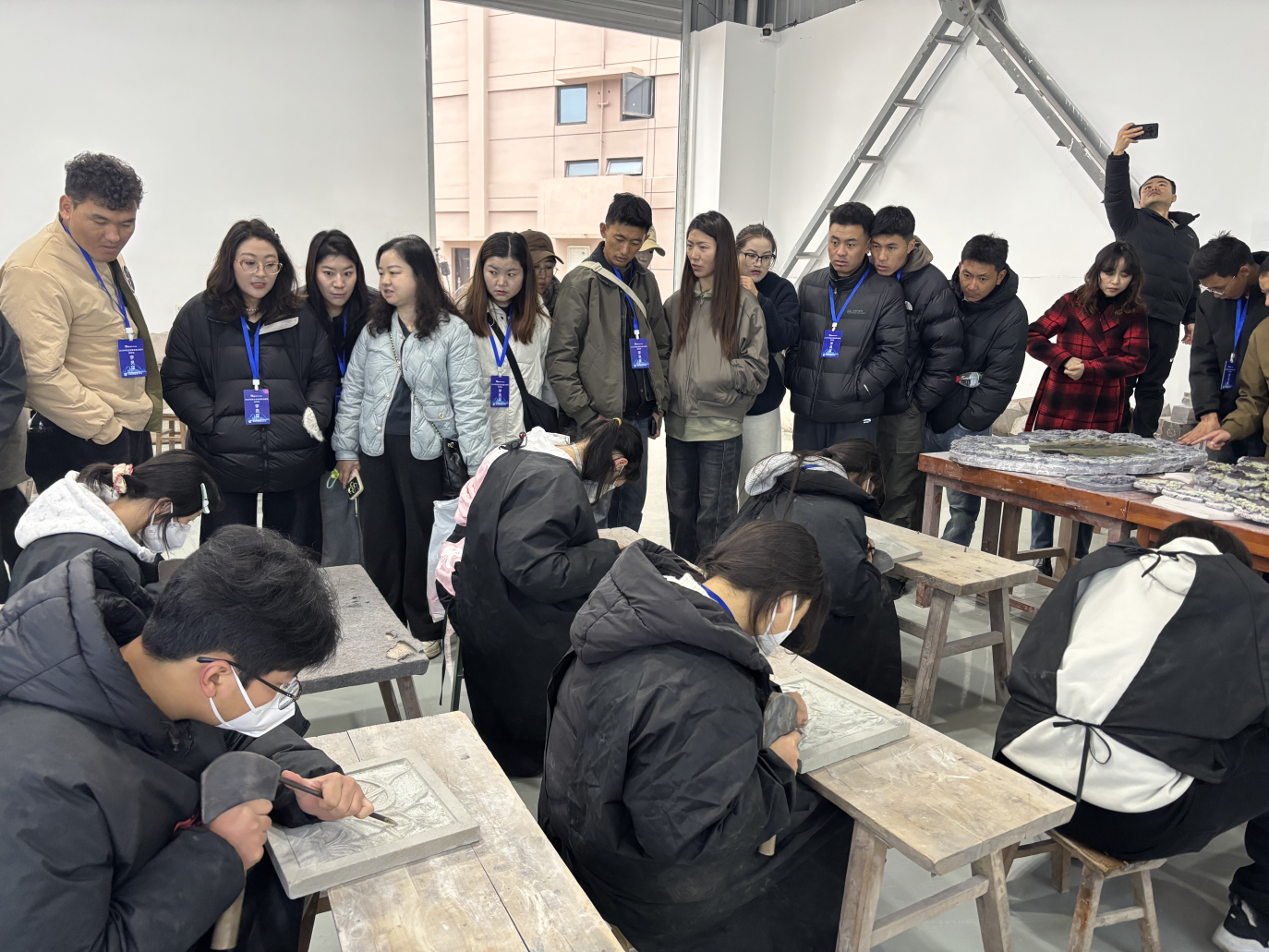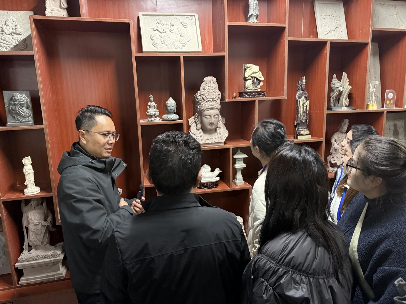 考察首站,那曲职校一行来到大足职教中心——大足石刻文创园石雕石刻实训基地。在大足职教中心副校长李再明的详细讲解下,那曲职校同仁深入了解大足石刻工匠精神与校园文化深度融合的实践路径。