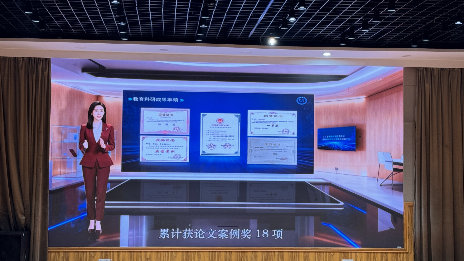 汇报发言环节。李再明工作室学员代表以数字人形式详细汇报了工作室教研成果,杨华文工作室学员任学文分享了个人成长感悟,唐晓堃老师作为主持人代表总结了工作室研修经验与未来展望。
